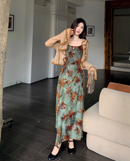 French style retro green printed dress with slim waist and suspenders long dress with lace cardigan R1695