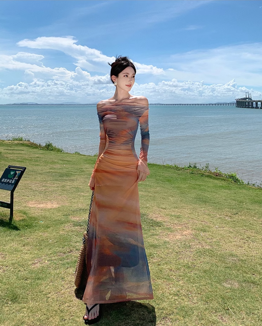Beach dress with slim waist and elegant long sleeves, holiday style tie-dye dress R1606