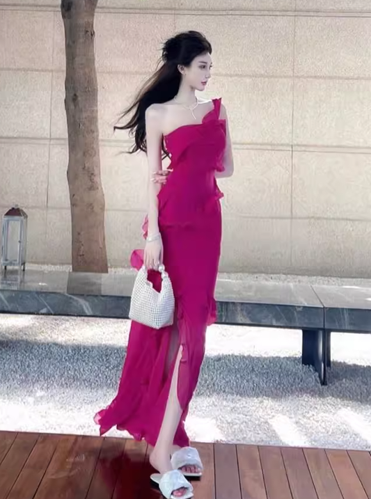 French suspender dress rose red white ruffled slit drape elegant long skirt R1611