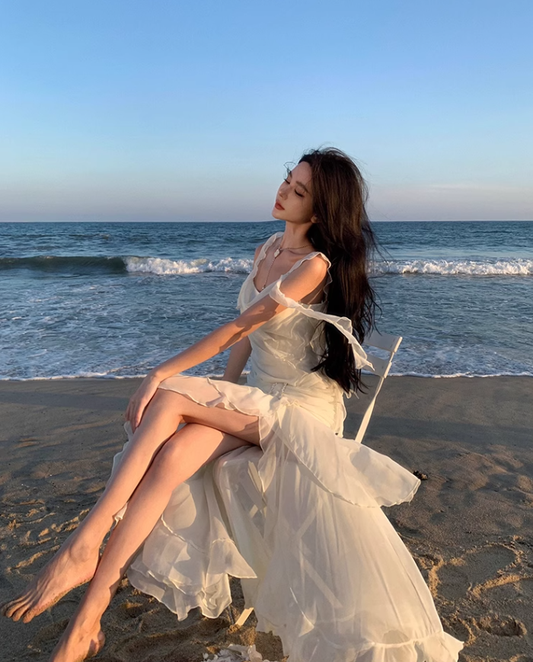 Super fairy long skirt with small flying sleeves white waist-baring dress holiday beach skirt R1607