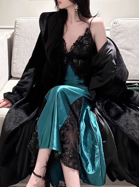 High-grade sequined lace satin dress 2025 plus size evening dress suspender skirt R1116