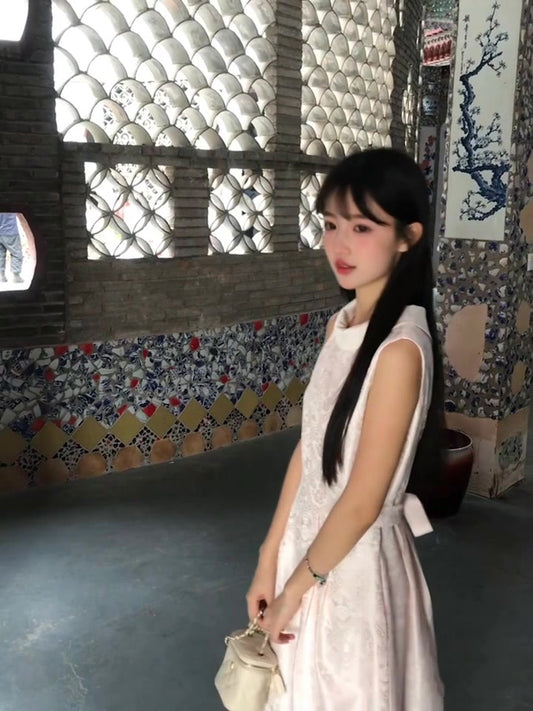 Pink jacquard vest dress gentle temperament waist A-line short skirt R0826