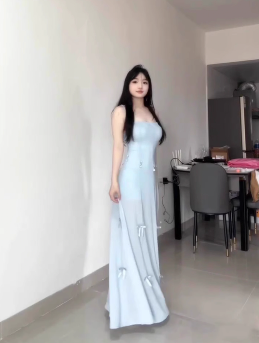 One dress with multiple wears Blue bow suspender dress Gentle temperament waist A-line long skirt R0464