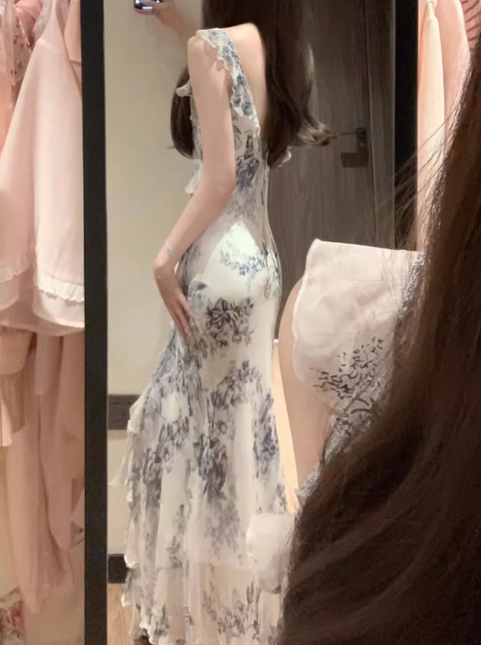 Ink painting suspender dress new style high-end feeling super beautiful tea break French long skirt R0463