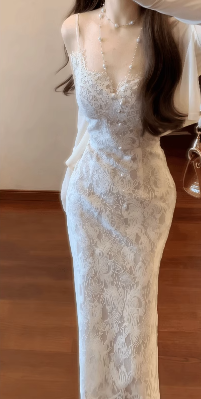 French gentle style white lace suspender dress 2025 new style temperament high-end waist slim hip skirt R0455