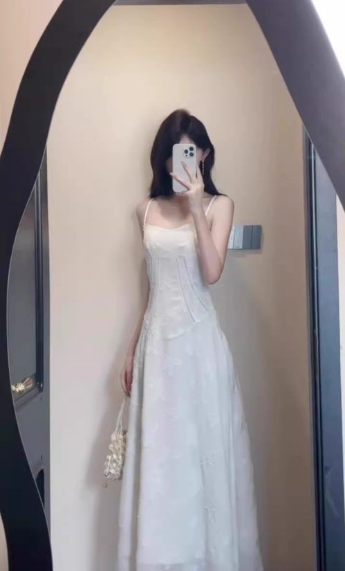 Gentle white moonlight jacquard sling dress beautiful temperament waist a-line long skirt 2025 new R0461