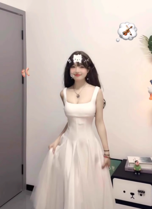 White suspender dress gentle temperament high-end dress waist A-line princess dress R0458