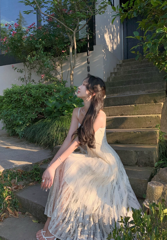 Romantic holiday style suspender dress summer hollow white lace temperament long skirt R4423