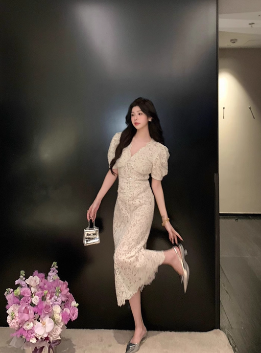 French beige exquisite diamond-studded elegant lace Chanel style long dress R4078