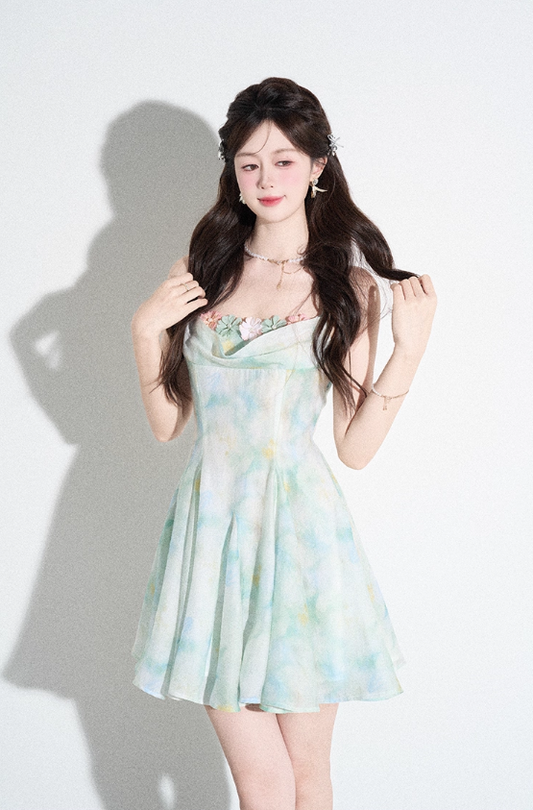Three-dimensional flower suspender dress beautiful summer ruffled large swing A-line skirt R4109