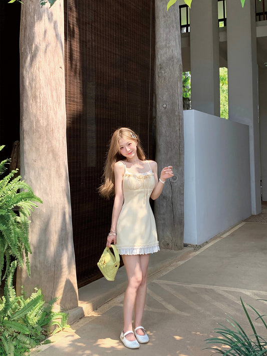 Cream Yellow Halter Neck Dress Summer French Tulle Short Skirt Babydoll Skirt R3833