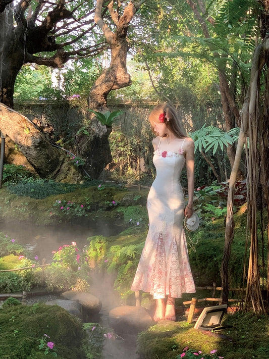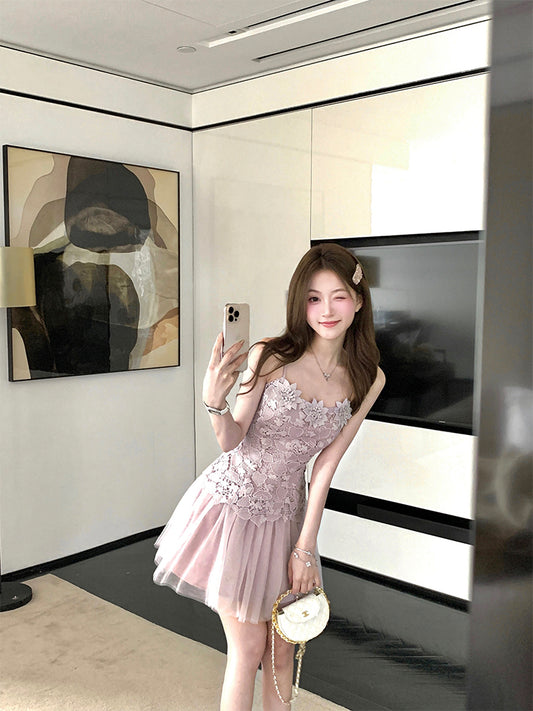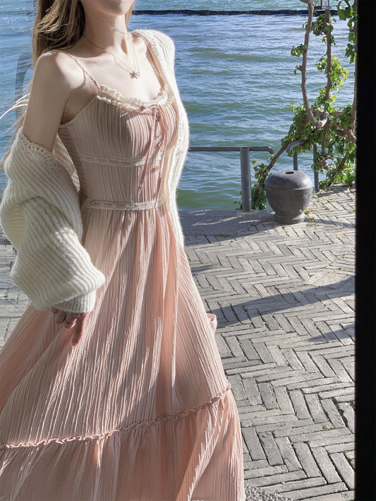 Gentle fairy nude pink lace sling long skirt dress R3872