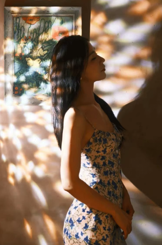 Dress Blue Butterfly Holiday Floral Waist Slimming Hip Sling Long Dress R2907