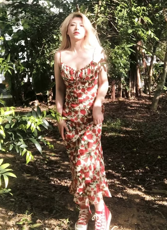 Dress Red Fruit Floral French V-neck Sleeveless Slim Fit Suspender Dress R2908