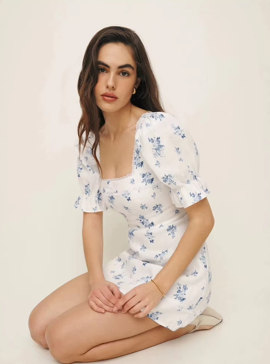 Printed square neck short sleeve dress French retro style waist slim long skirt R2909