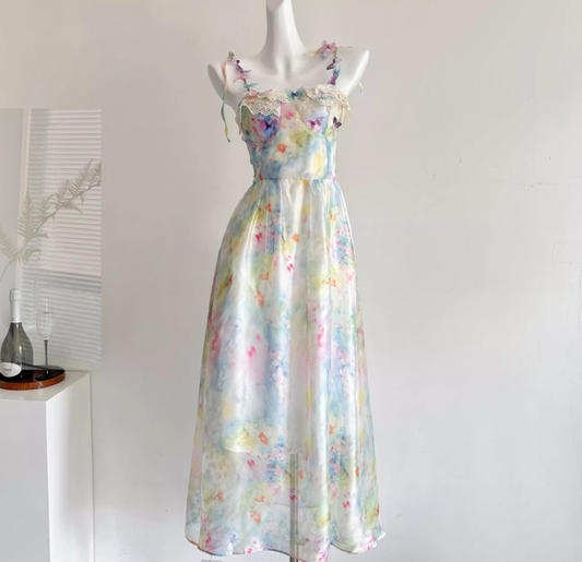 Beautiful suspender dress French holiday style blurred floral long skirt R2041