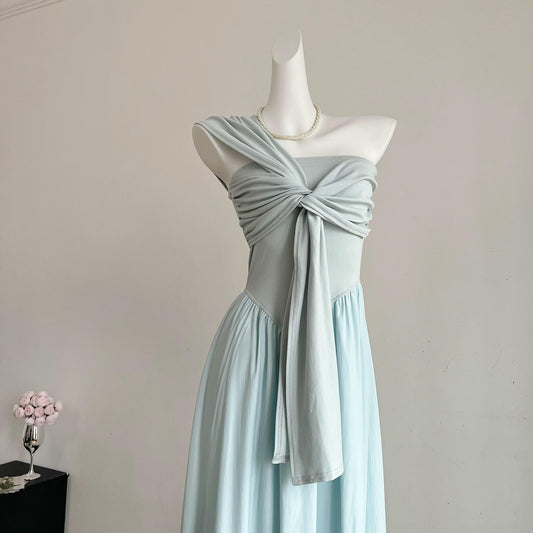Slimming waist sleeveless hollow pure off-shoulder casual long knitted dress R2039