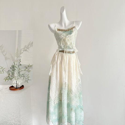 Embroidered Moon Exotic Style Fake Two-Piece Embroidered Suspender Lace Layered Skirt R2047