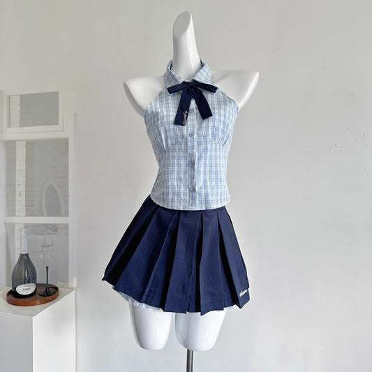Senior sister summer niche sweet hot girl plaid halterneck suit R2046
