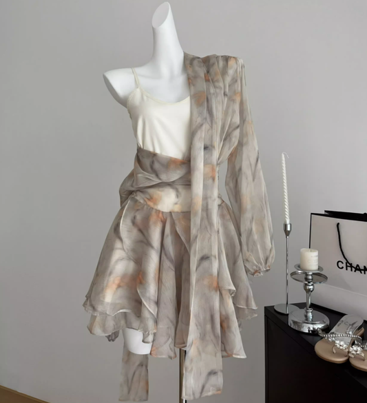 Long-sleeved V-neck puff sleeve chiffon yellow floral dress two-piece waisted short skirt R2022