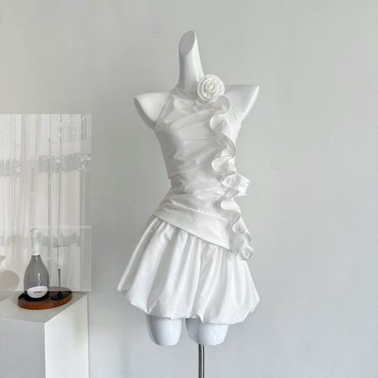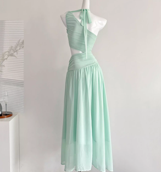 Sleeveless halter dress with waist and ruffled French long skirt R2027