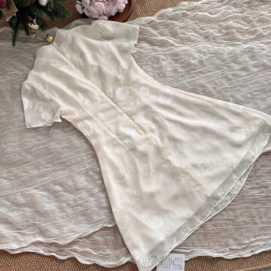High-grade low-cut white heavy lace trumpet sleeve short long-sleeved dress R2025