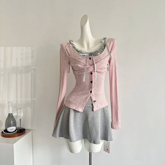 Lace Camisole Off-shoulder Cardigan T-shirt Set Pure Desire Long-sleeved Top R2028