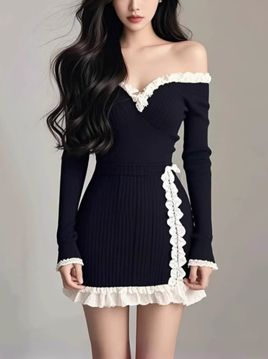 Design sense low neck long sleeve dress 2025 waist hip short skirt R1282