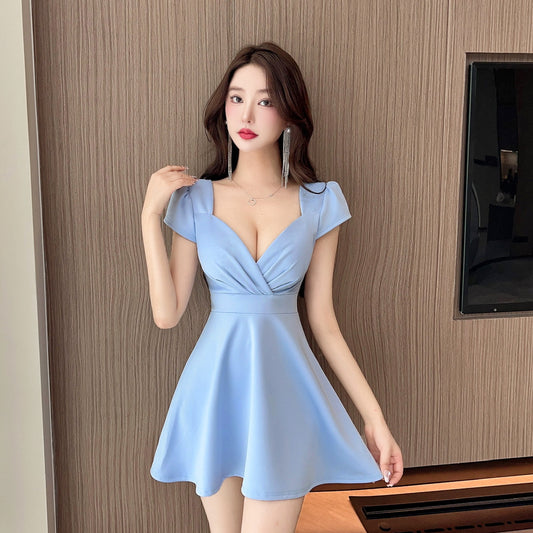 Light blue bow dress with short sleeves, slim waist and elegant short skirt R4419