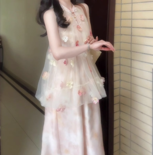Pink buttoned mesh halter neck dress gentle temperament loose A-line long skirt R0751