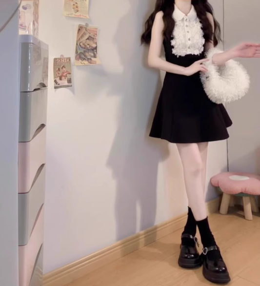 High-grade black sleeveless vest dress with lace waist and a-line tutu skirt R0755