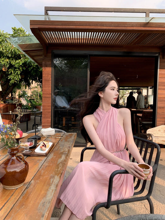 Pink sleeveless halter dress gentle style super beautiful dress R0727