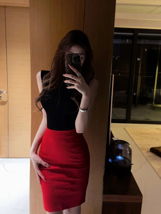 Slim-fitting black sleeveless top and red hip-hugging skirt are a complete set R0726