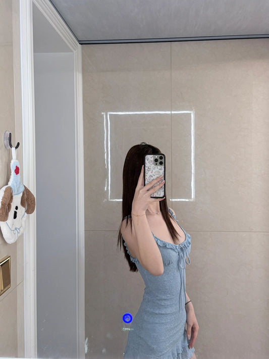 Sexy retro blue suspender dress beautiful waist slim a-line short skirt R0724