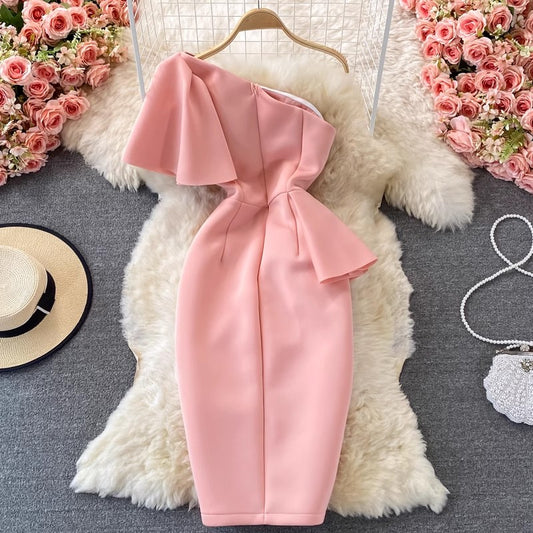 ruffled shoulder dress Female off-shoulder slit dress S3906
