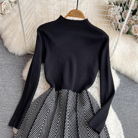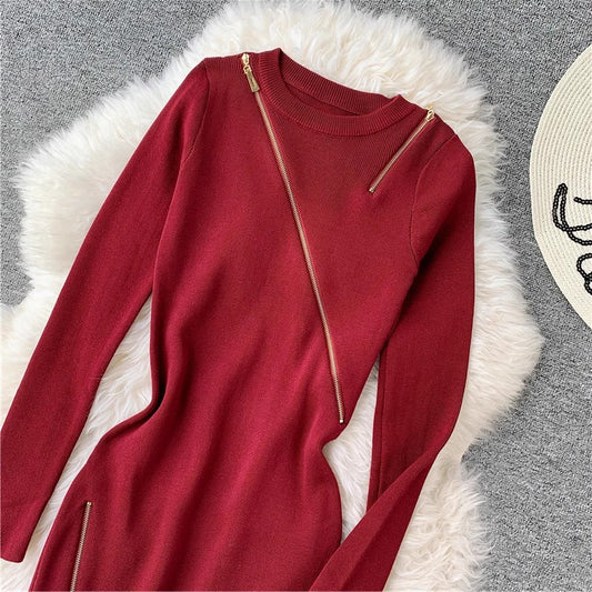 Round Neck Knitted Dress Women's Mid-Length Sweater Skirt Zipper Slit S3911