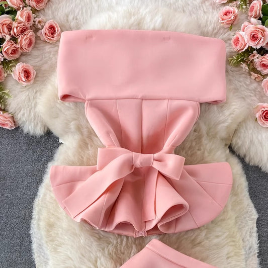 off-shoulder ruffled cropped top two-piece suit mid-length skirt S3919
