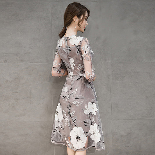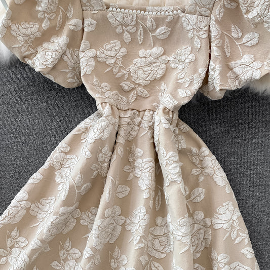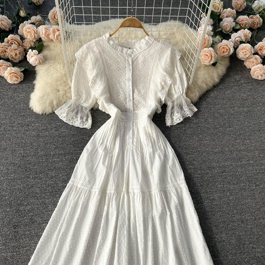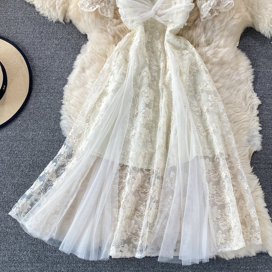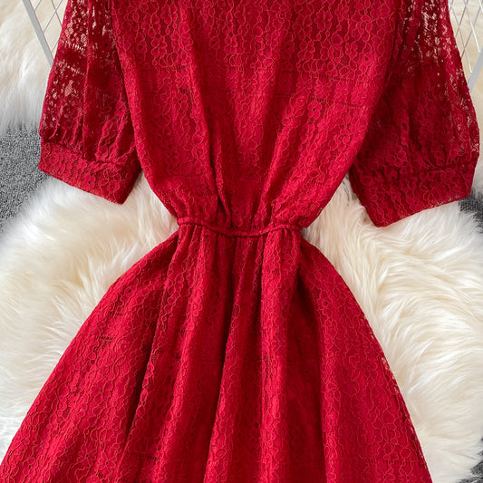 French Square Neck Lace Dress Elegant Women Summer Short Sleeve Mesh S548