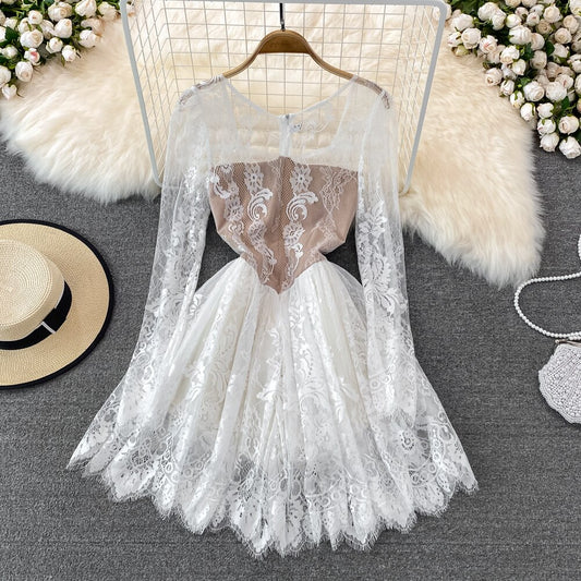 Sexy Hollow Out Mesh Lace Mini Dress Fashion Spring Summer Long Sleeve S547