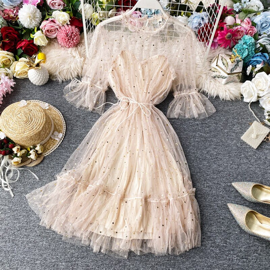 Party Dresses Bright Summer Women Mesh Ruffles Waistband Stars Sequined S549