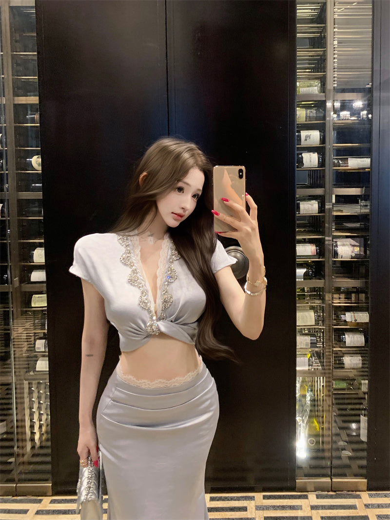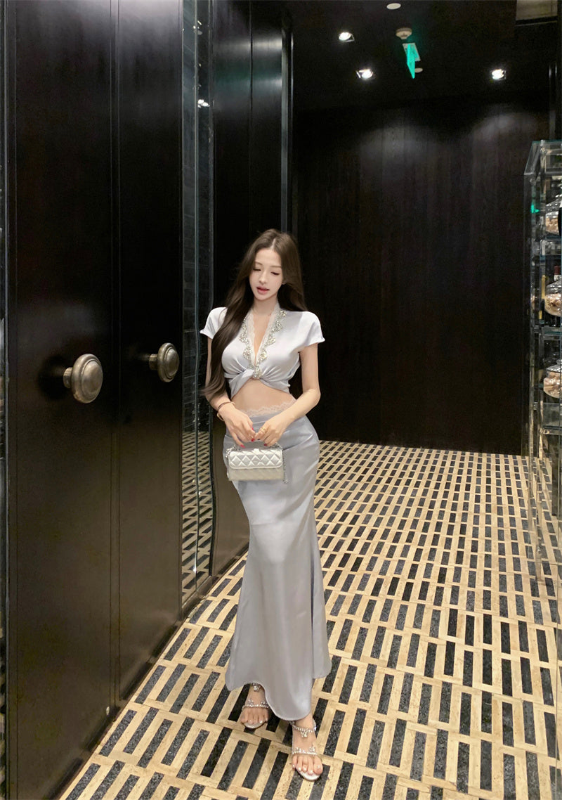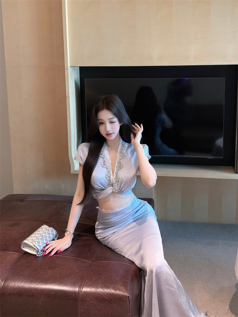 A blue V-neck short-sleeved top and skirt with a sense of luxury R0841