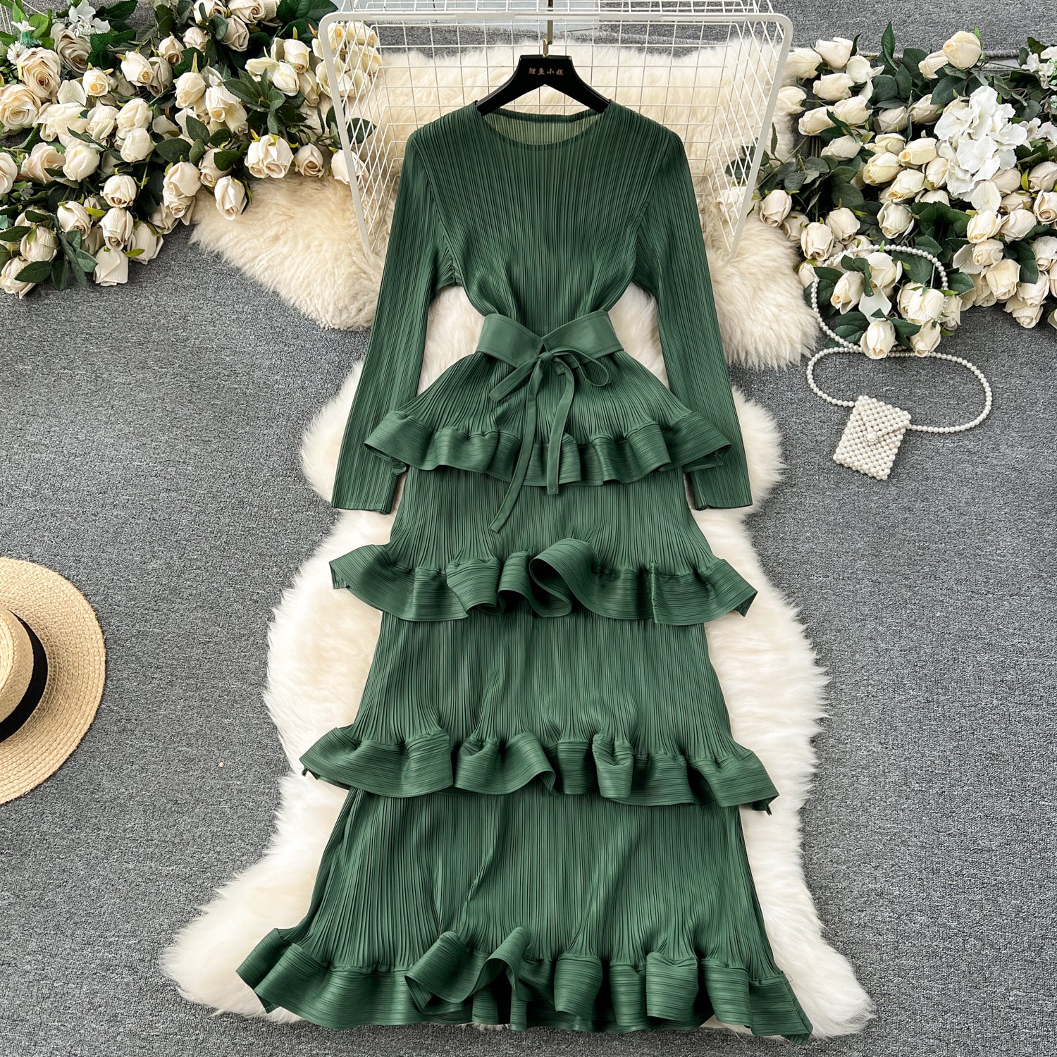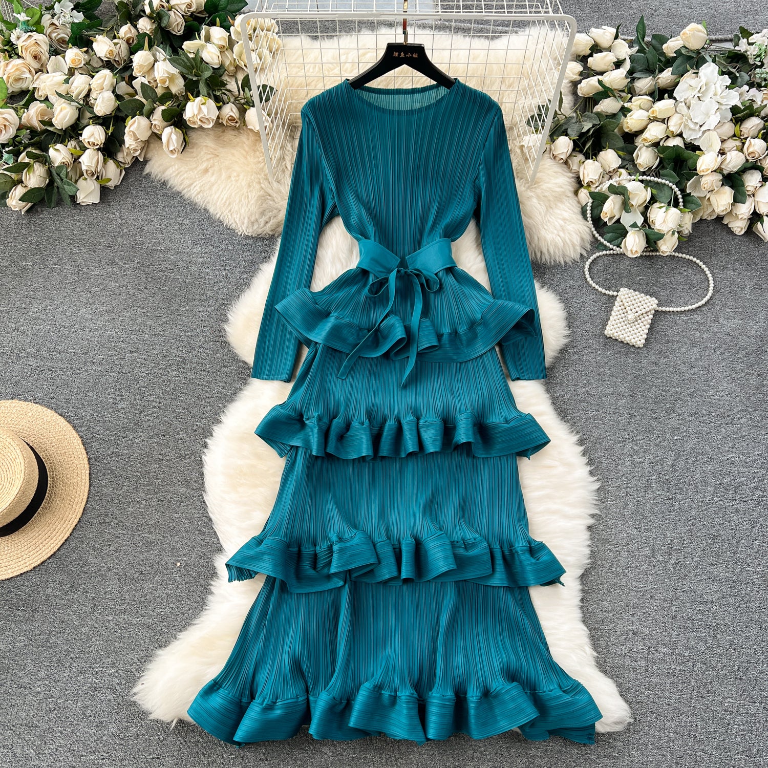 Banquet dress high-end niche ruffle cake skirt pleated slim long dress R2151