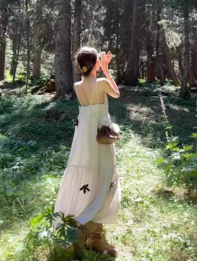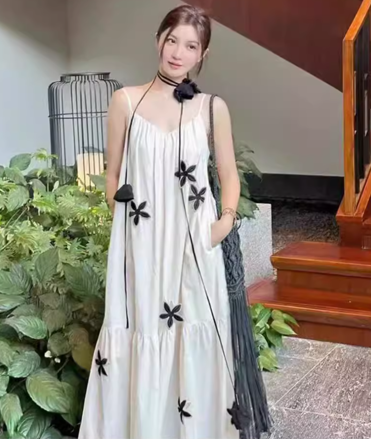 Beach dress with embroidered flowers, cotton and linen, holiday style, loose suspender dress R1610