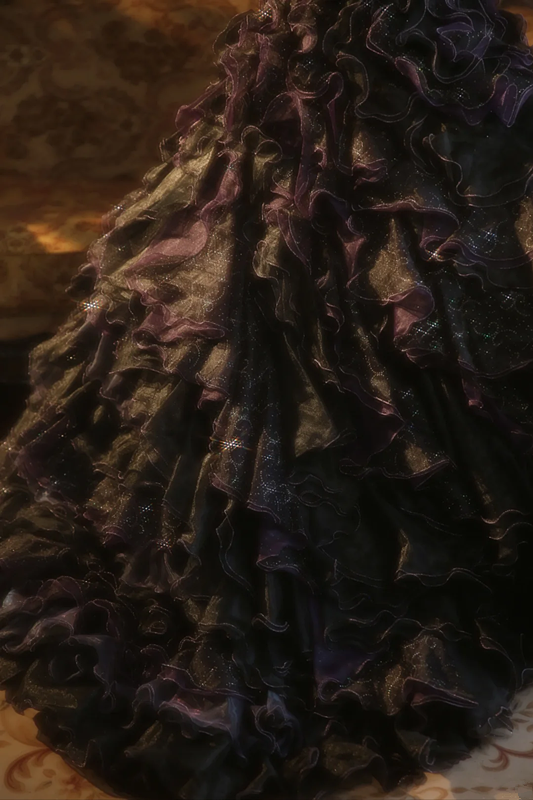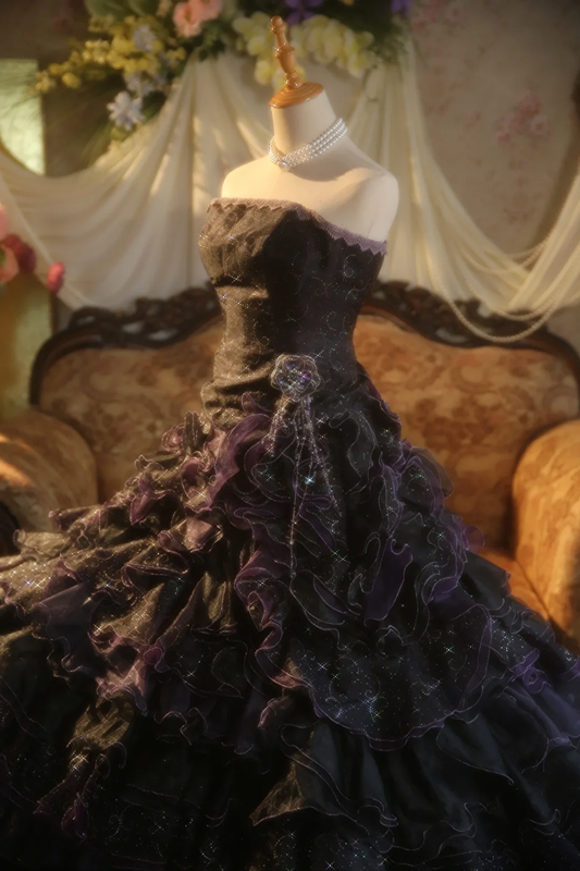 Black strapless ball gown with a cinched waist and a tiered cake skirt; bridal gown R7284