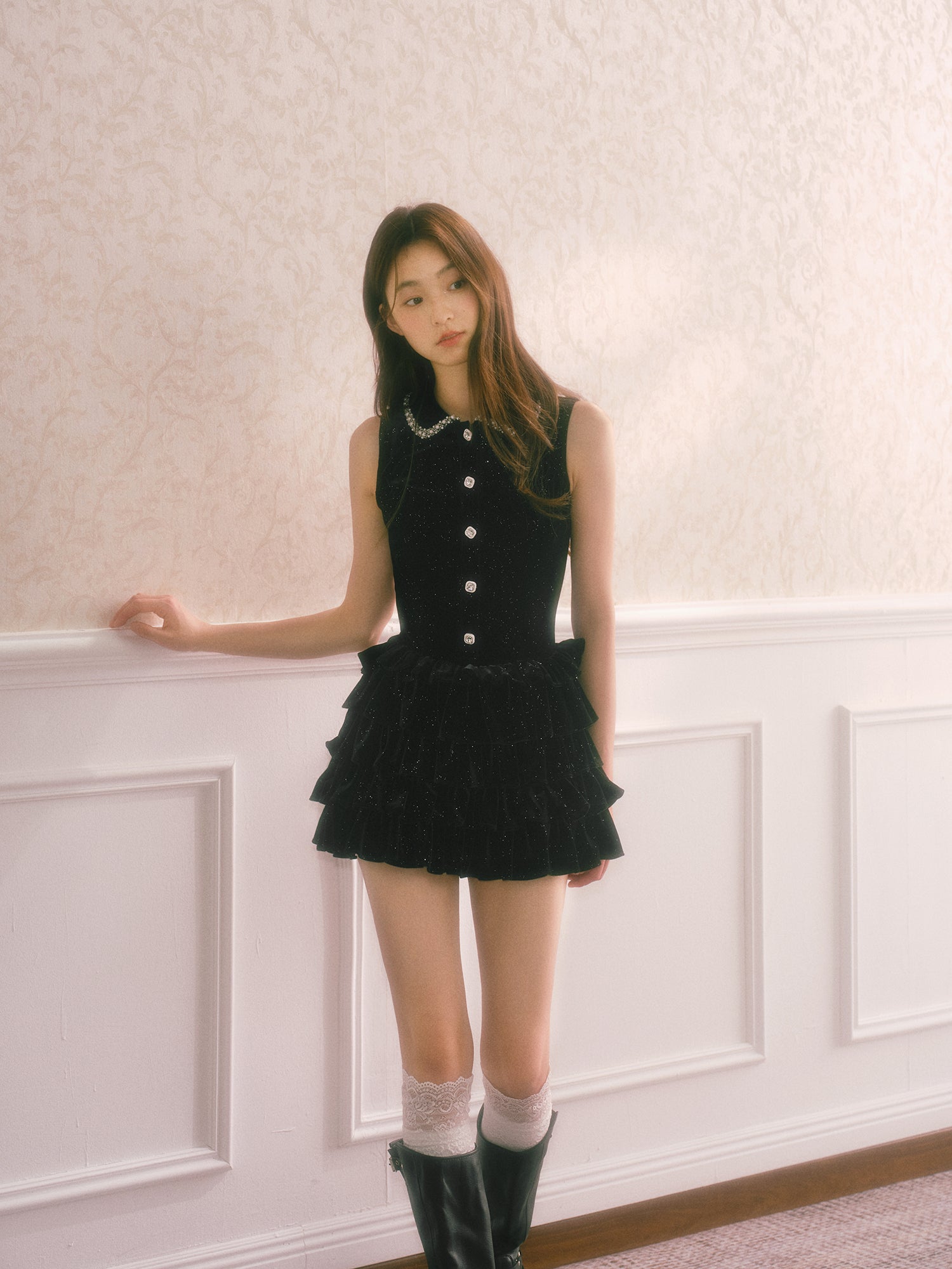 Black velvet shimmering qianjin style cake-style lace waist belt puffy dress R5175