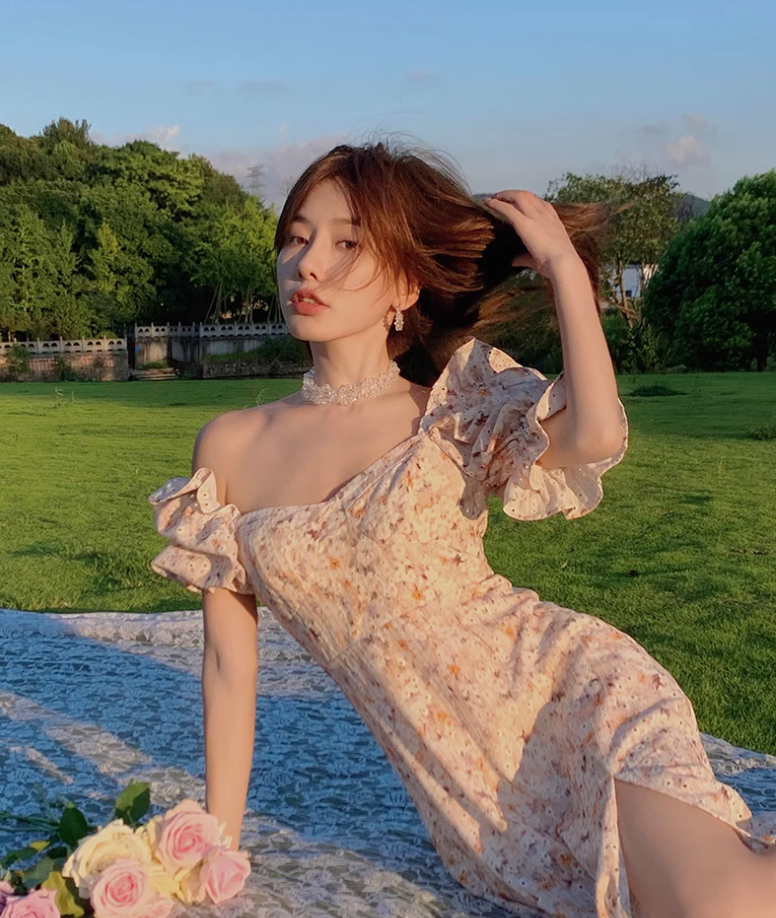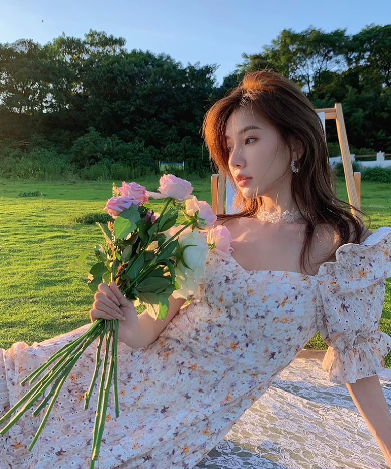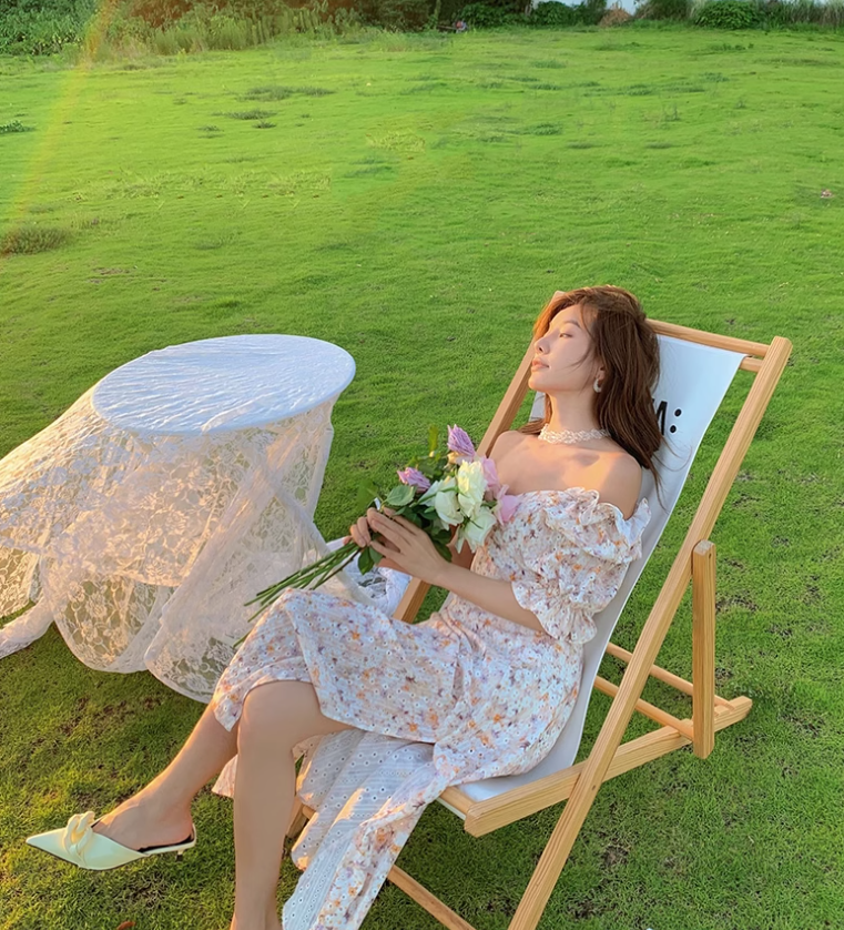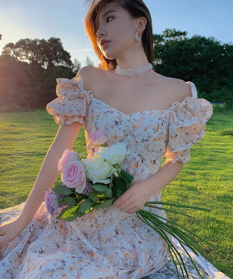 Camellia encounter floral dress holiday style French long skirt R2706
