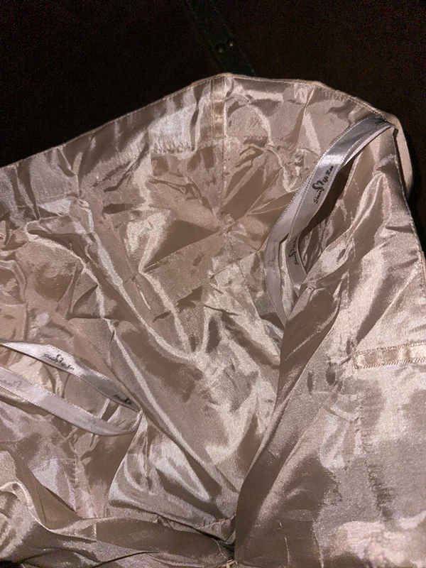 Champagne-colored strapless, fitted waist, asymmetrical hem ball gown R7046