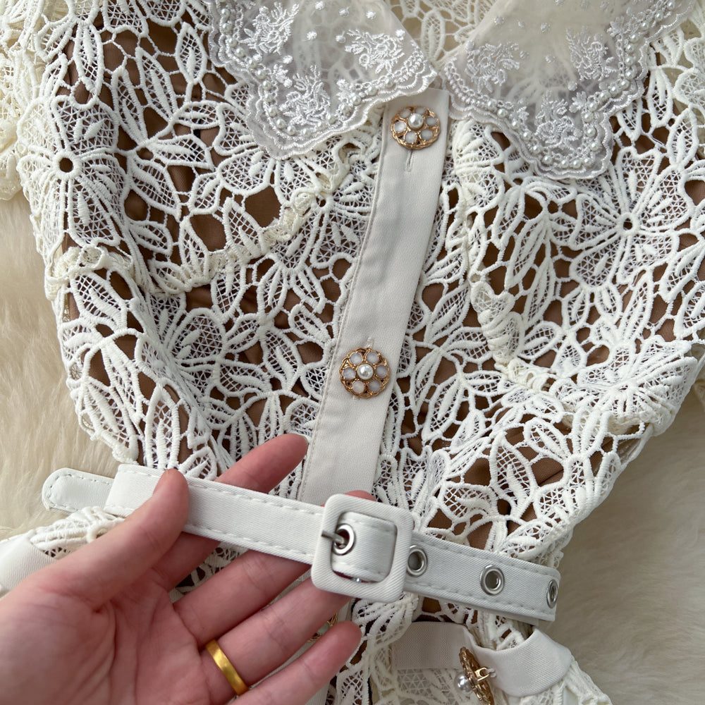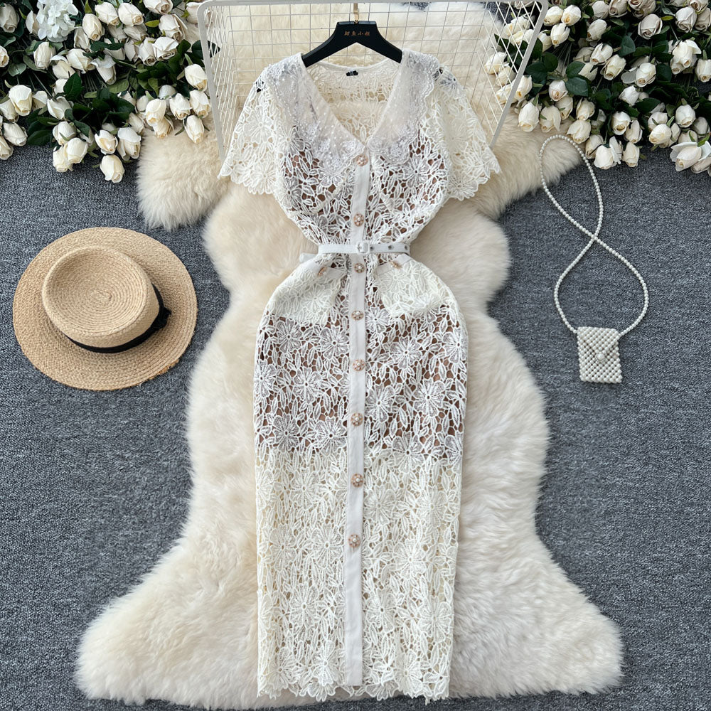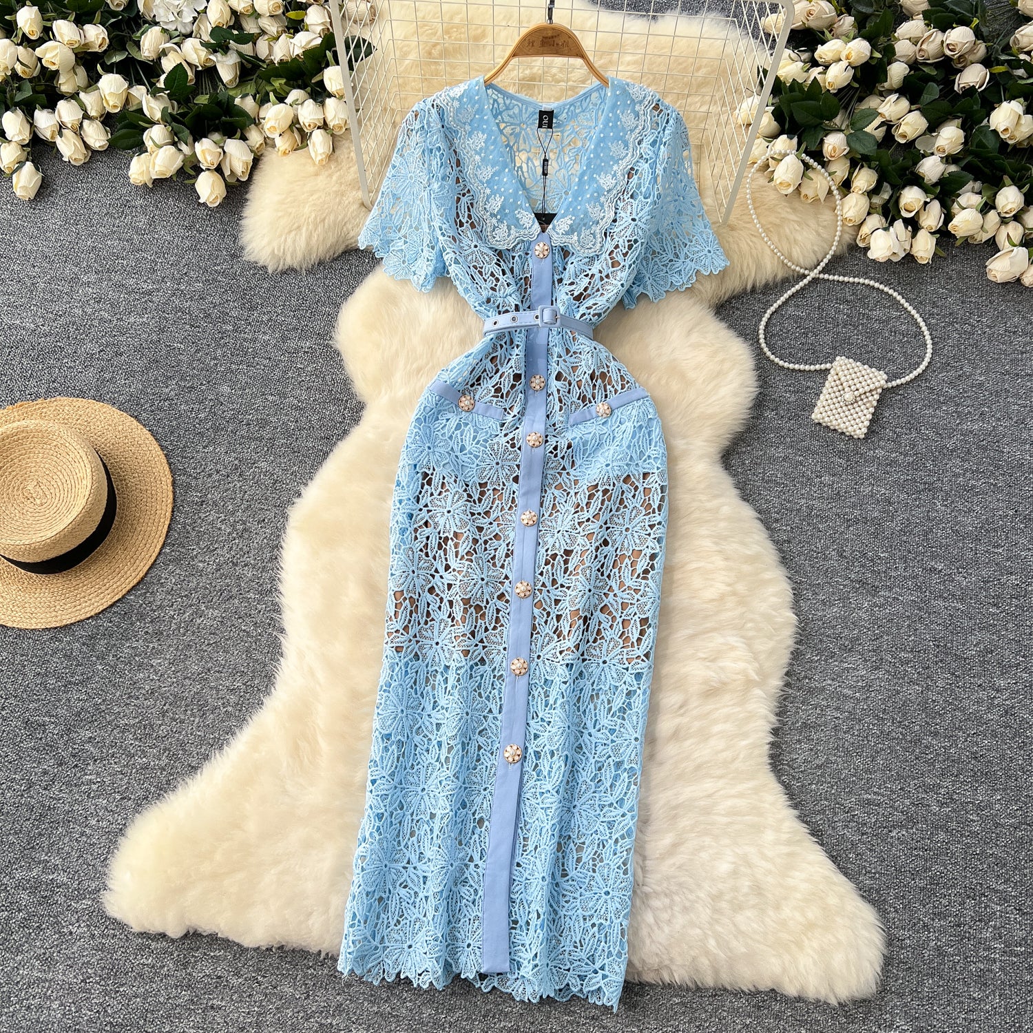 Chanel style dress with short sleeves, short-sleeved, single-breasted lace crochet long skirt R2300