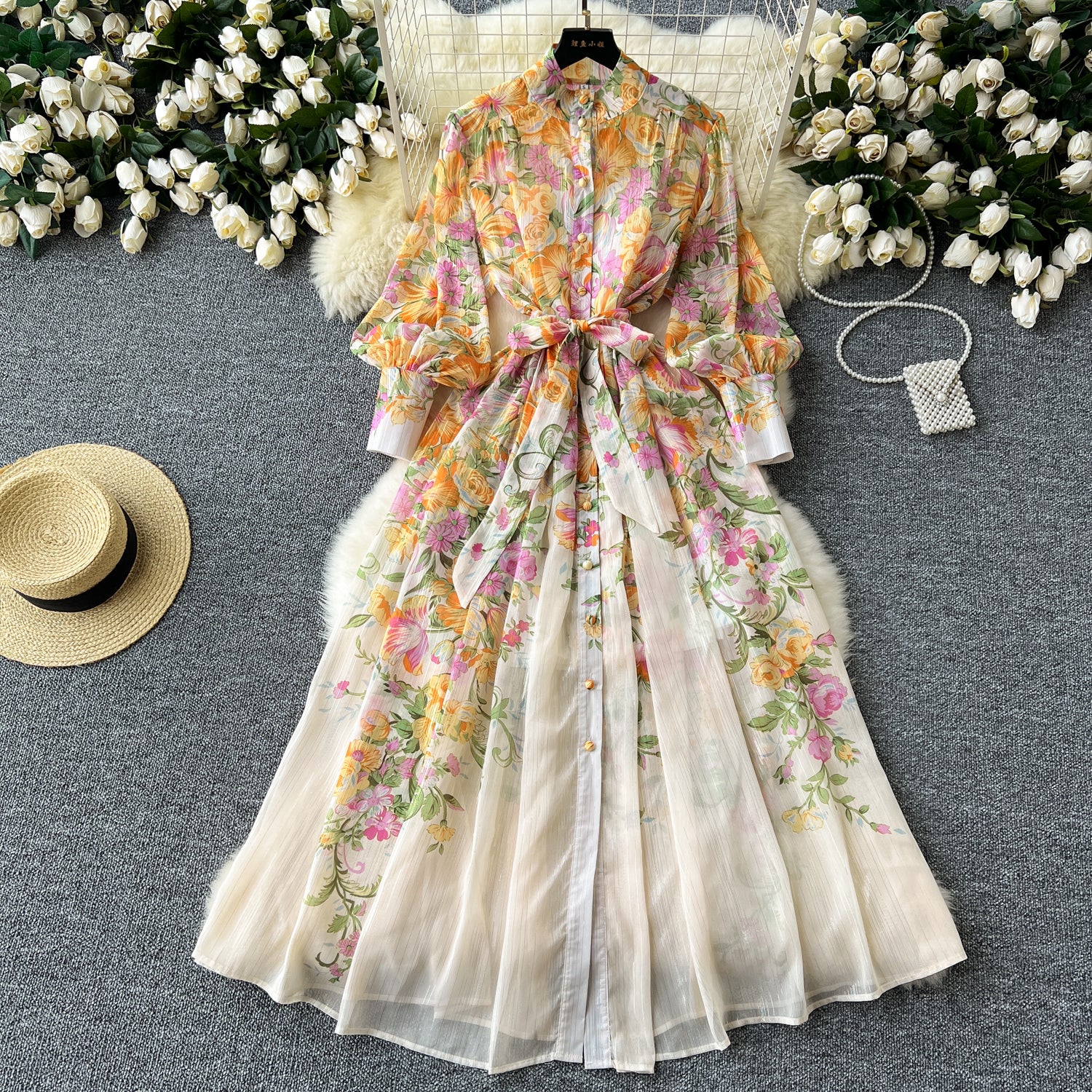 European and American printed dress stand collar waist tie long dress French chiffon skirt R2220