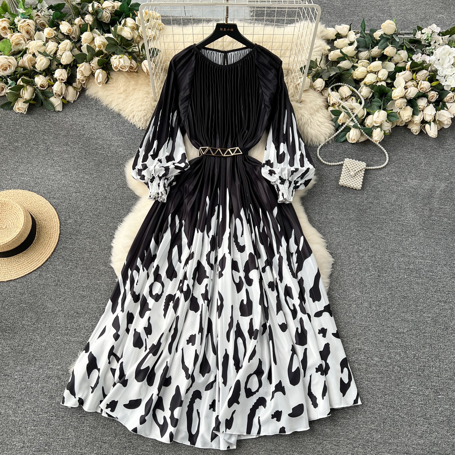 European and American style 2025 new dress printed pleated pleated waist tie holiday long skirt R2337